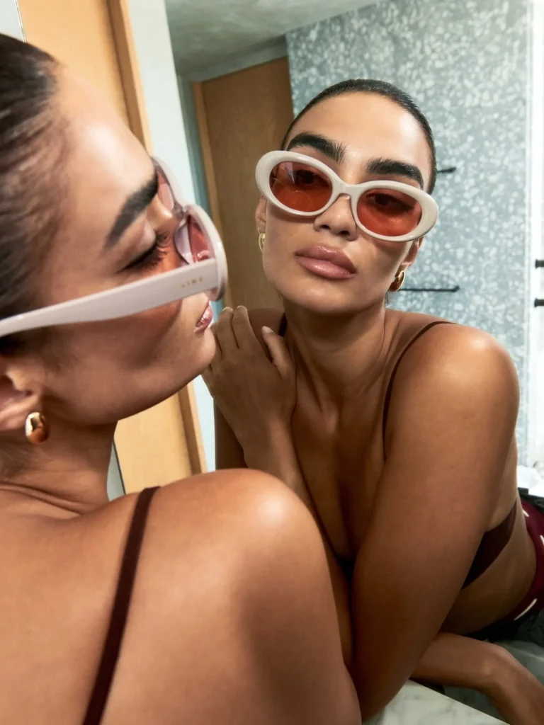How to Style: Keep the rest of your outfit clean and neutral — think sleek tracksuits or minimal dresses — so the shades remain front and center.